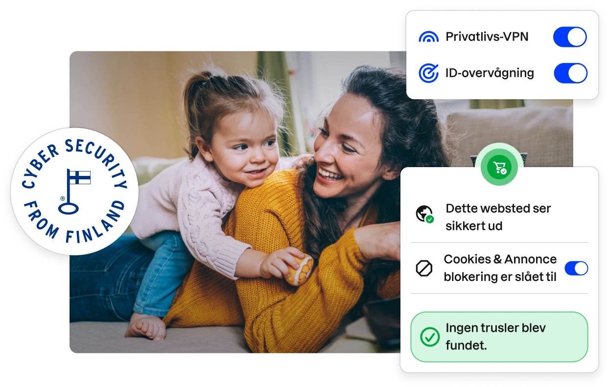 Alle personer er et potentielt mål for nutidens cyberkriminelle. Uden omfattende internetbeskyttelse er alle dine enheder, penge og endda din identitet i fare. Fuldend din beskyttelse mod avancerede onlinetrusler med F‑Secure Total og dets antivirus, VPN og identitetsbeskyttelsesværktøjer.