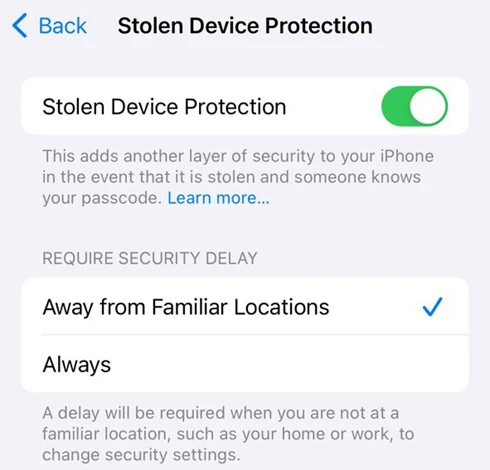 When the new Stolen Device Protection feature is enabled, it provides additional security requirements for selected actions when you’re away from familiar locations.