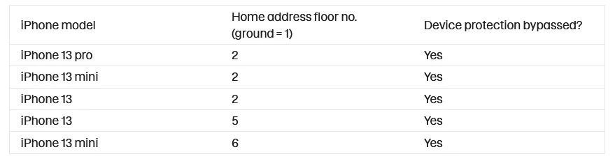 I’ve conducted initial tests on 5 iPhones, each with different home addresses belonging to real individuals. Through these tests, I’ve verified that the barrier to bypassing the Significant Location feature was quite minimal and did not need to include any technical knowledge. Merely being near the entrance of the victim’s building or beneath their balcony, even in cases where the residence was situated on an upper floor (6th or 5th floor for example), was sufficient to prompt the iPhone’s Significant Location feature to recognize the device as being at home. This recognition deactivated certain features, one of them is Stolen Device Protection.