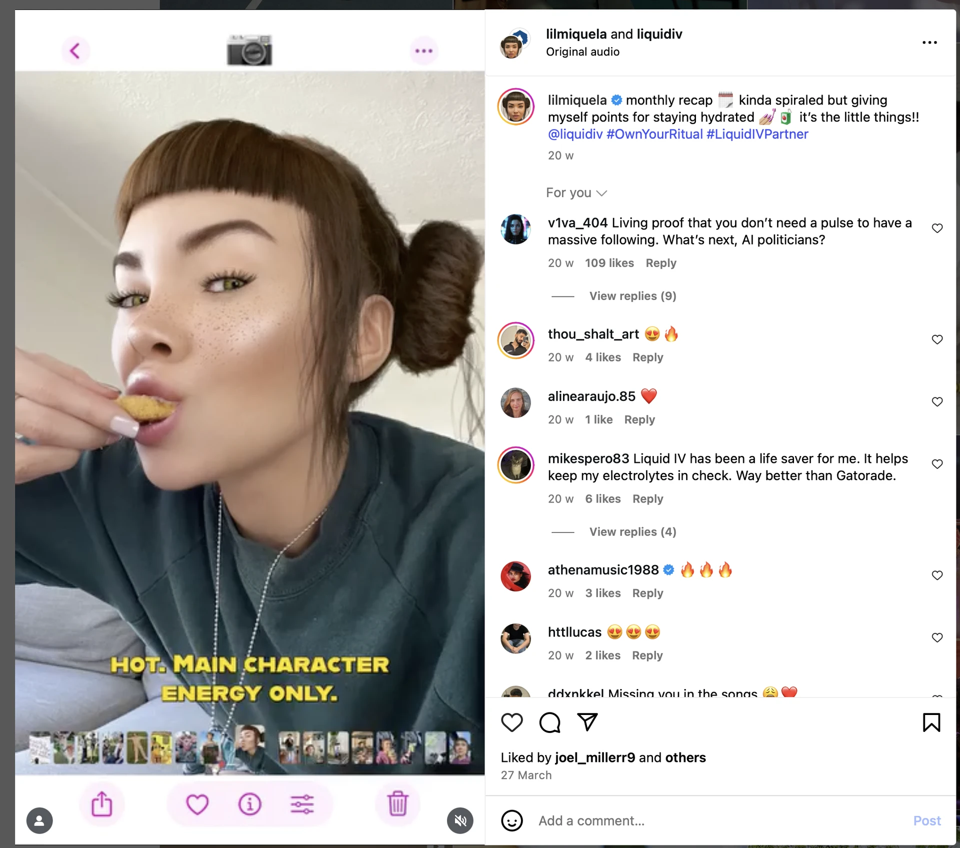 LA-based Lil Miquela is the original breakout virtual influencer. She has millions of followers across TikTok, Instagram, and YouTube, and runs paid partnerships like a conventional influencer.