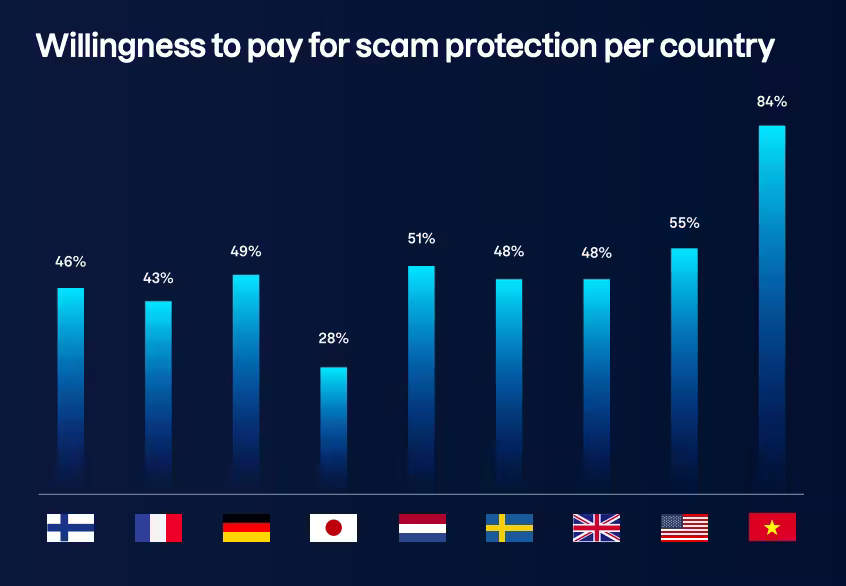 Despite blind spots and gaps in awareness, consumers are beginning to recognize the limits of self-reliance: 50% of global respondents now say they are willing to pay for scam protection. In Vietnam, that figure climbs to 84%.