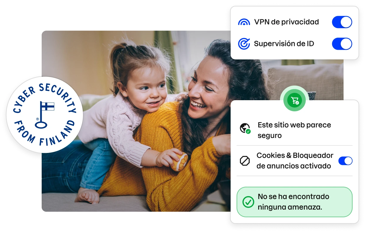 La seguridad en Internet se refiere a cómo usted y sus dispositivos están protegidos en Internet. Mantenerse a salvo de las amenazas en línea avanzadas de hoy en día sin una protección adecuada en Internet es casi imposible. Es por eso que necesita F‑Secure Total como su suite integral de seguridad de Internet para mantenerlo a salvo. Para cubrir su seguridad en línea desde todas las direcciones, asegúrese de usar todas las funciones de seguridad avanzadas, como el software antivirus, la protección contra malware, la navegación privada, la administración de contraseñas y el monitoreo de la web oscura.