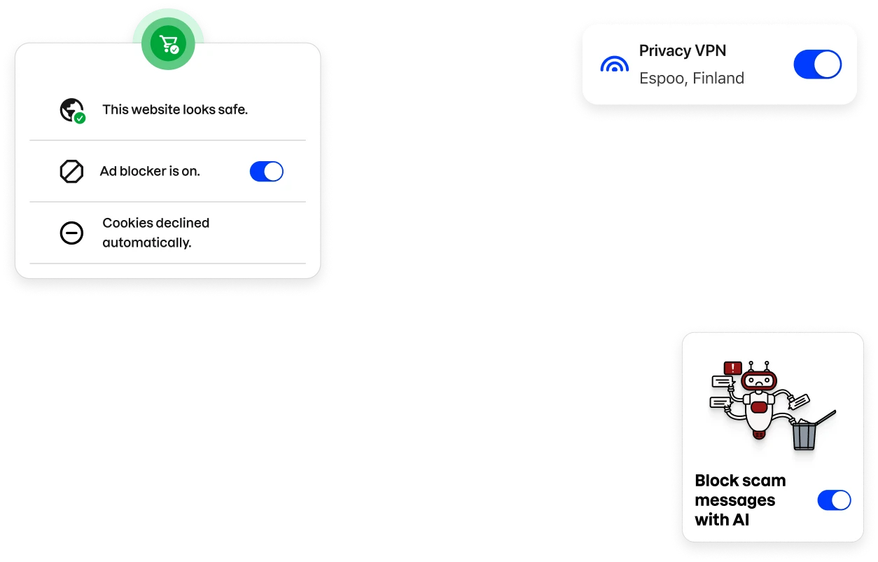 Scam Protection keeps your personal information and money safe from scammers. Shop safely from trustworthy retailers and get notified of the untrusted online stores. Block SMS scams automatically with the latest AI technologies and avoid malicious websites and links before you land on them. Get alerted about unsafe Wi-Fi networks on the go. Decrease your exposure to potential scams by blocking ads and see less cookie consent prompts with the Cookie blocker.