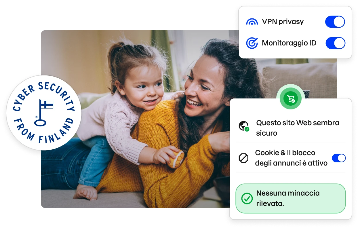 La sicurezza in Internet si riferisce al modo in cui tu e i tuoi dispositivi siete protetti su Internet. Rimanere al sicuro contro le minacce online avanzate di oggi senza un’adeguata protezione Internet è quasi impossibile. Ecco perché hai bisogno di F‑Secure Total come suite di sicurezza Internet completa per tenerti al sicuro. Per proteggere la tua sicurezza online da tutte le direzioni, assicurati di utilizzare tutte le funzionalità di sicurezza avanzate, inclusi soft­ware anti­virus, protezione da malware, navigazione privata, gestione delle pass­word e monitoraggio del dark web.