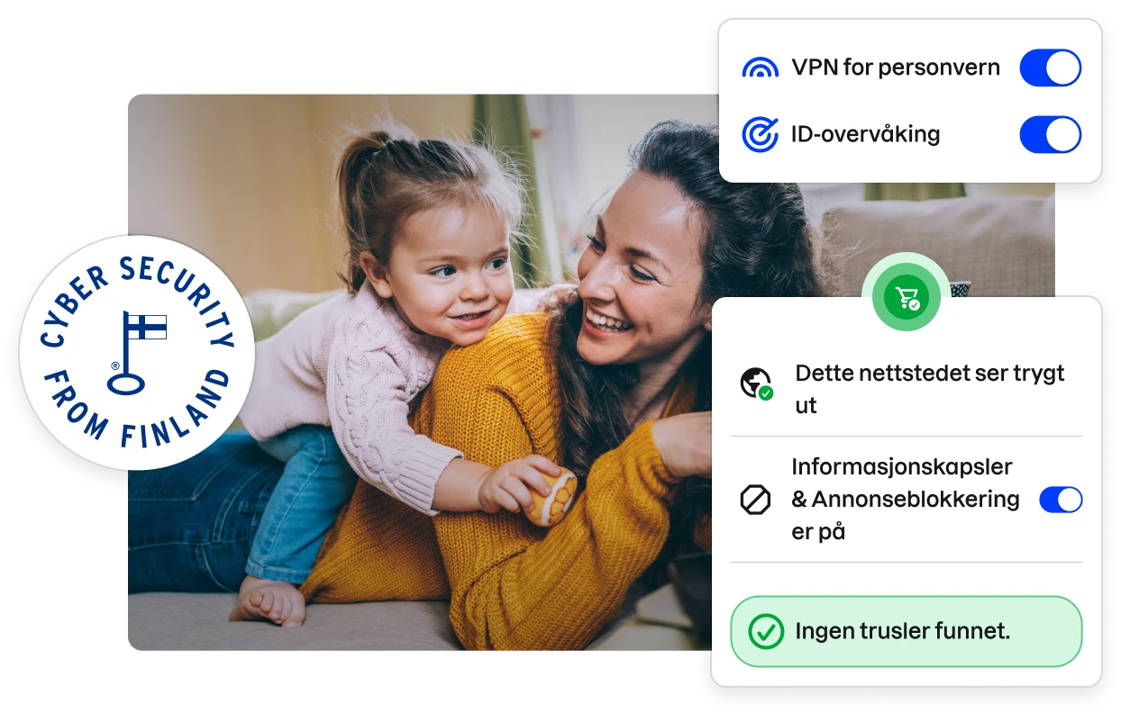 Hvert individ er et attraktivt mål for dagens cyberkriminelle. Uten omfattende internettbeskyttelse er alle enhetene dine, penger og til og med identiteten din i fare. Fullfør forsvaret ditt mot avanserte nettrusler med F‑Secure Total og dets antivirus-, VPN- og identitetsbeskyttelsesverktøy.