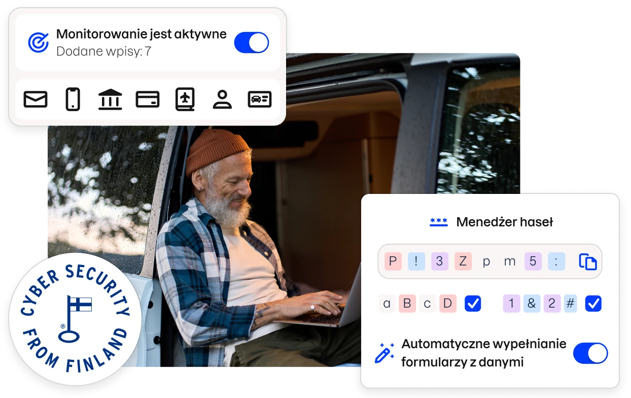 Menedżer haseł i funkcja monitorowania naruszeń danych F‑Secure ID Protection pomagają zapobiegać użyciu haseł do kradzieży tożsamości. Jeśli zauważysz podejrzane działanie i sądzisz, że Twoje dane osobowe zostały skradzione lub niewłaściwie użyte, możesz skontaktować się z działem pomocy w przypadku kradzieży tożsamości. Dzięki poradom naszych specjalistów odzyskasz kontrolę nad swoją cyfrową tożsamością.