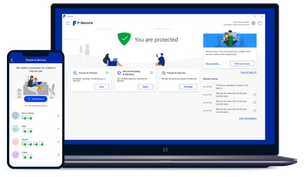 Dagens avancerade onlinehot kräver avancerat onlineskydd som även skyddar mobila enheter. F‑Secure Internet Securitys antivirus skyddar dig från skadeprogram och andra onlinehot med omfattande säkerhetsfunktioner.