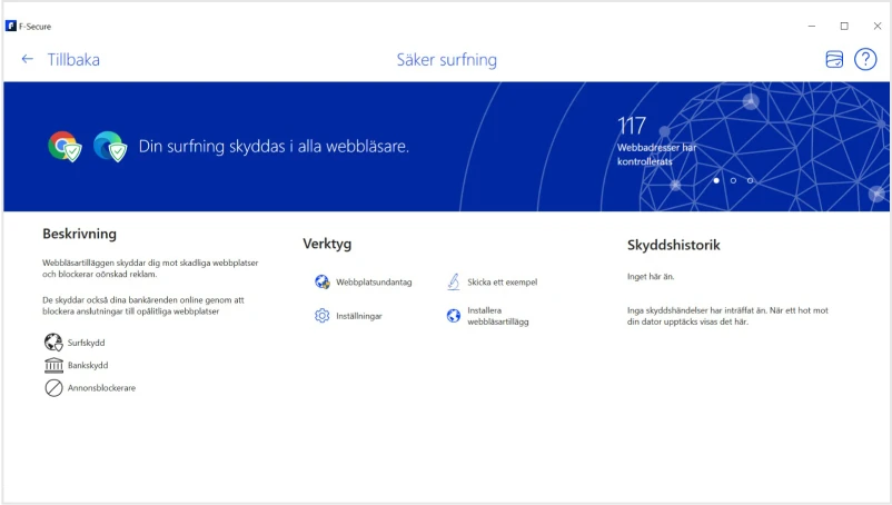 Utforska internet tryggt utan att bekymra dig för riskfyllda eller farliga webbplatser. Surfskyddet blockerar skadliga webbplatser och skyddar dina data. Färgkodade sökresultat varnar dig om misstänkta webbsidor innan du klickar på dem.