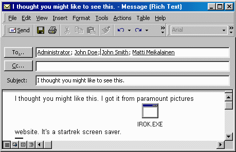 During the next Windows startup, the IROKRUN.VBS script will be executed. It uses Microsoft Outlook to send the worm executable as IROK.EXE to 60 recipients whose addresses are taken from each of Outlook's address books.