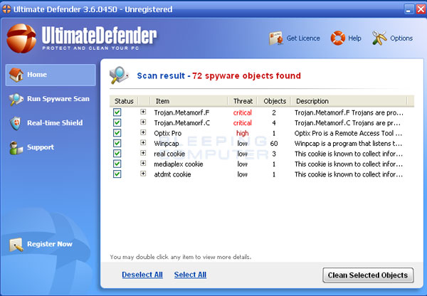 As with most rogues, UltimateDefender is a misleading application that may give fake or exaggerated scanning results to scare the user into buying a license in order to remove the detected the "infection".