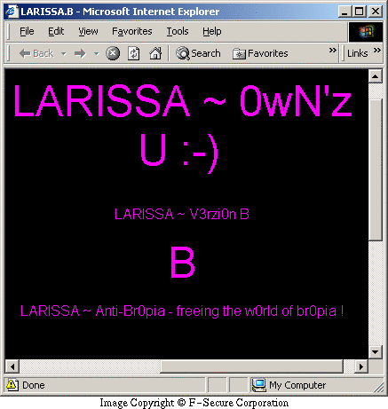 The worm drops a HTML file, C:\LARISSA_ANTI_BROPIA.html, and shows it. It contains the following text: