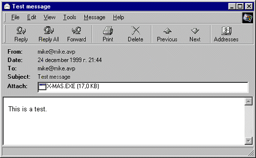 The virus body attached to an infected message is a Win32 PE executable X-MAS.EXE. The virus routine performs selection from six possible name variants depending on the current month, but fails due to a bug and as a result the file name is always X-MAS.EXE. The copmlete list of names looks like that: