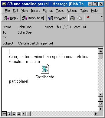 From: name-of-the-infected-user To: random-name-from-outlook-address-book Subject: C' una cartolina per te! Attachment: CARTOLINA.VBS Ciao, un tuo amico ti ha spedito una cartolina virtuale... mooolto particolare!