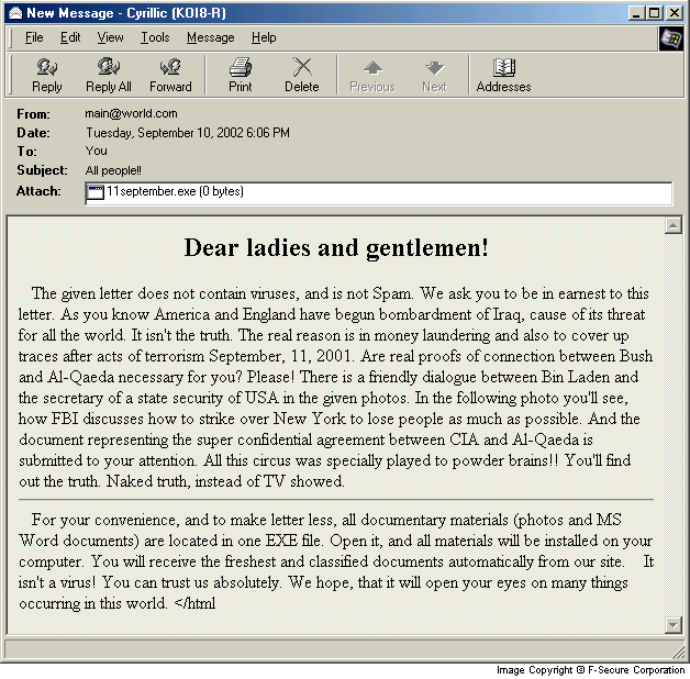 From: main@world.com To: all-people-in-the-address-book Subject: All people!! Attachment: 11september.exe Dear ladies and gentlemen! The given letter does not contain viruses, and is not Spam. We ask you to be in earnest to this letter. As you know America and England have begun bombardment of Iraq, cause of its threat for all the world. It isn't the truth. The real reason is in money laundering and also to cover up traces after acts of terrorism September, 11, 2001. Are real proofs of connection between Bush and Al-Qaeda necessary for you? Please! There is a friendly dialogue between Bin Laden and the secretary of a state security of USA in the given photos. In the following photo you'll see, how FBI discusses how to strike over New York to lose people as much as possible. And the document representing the super confidential agreement between CIA and Al-Qaeda is submitted to your attention. All this circus was specially played to powder brains!! You'll find out the truth. Naked truth, instead of TV showed. For your convenience, and to make letter less, all documentary materials (photos and MS Word documents) are located in one EXE file. Open it, and all materials will be installed on your computer. You will receive the freshest and classified documents automatically from our site. It isn't a virus! You can trust us absolutely. We hope, that it will open your eyes on many things occurring in this world.