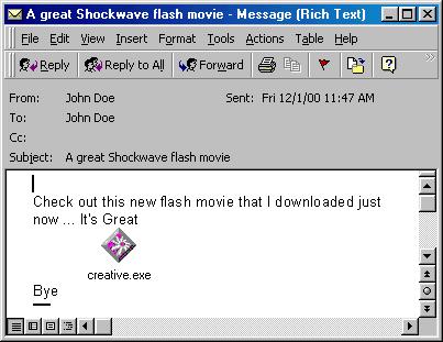 Subject: A great Shockwave flash movie Body: Check out this new flash movie that I downloaded just now ... It's Great Bye Attachment: CREATIVE.EXE