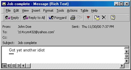 To:z14xym432@yahoo.com Subject: Job complete Message text: Got yet another idiot