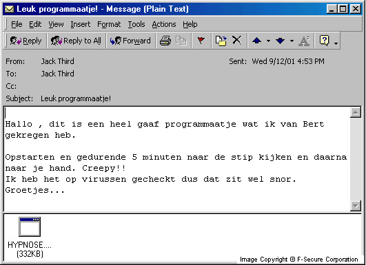 To spread itself the worm opens Windows Address Book and sends itself to all email addresses it can find there. The infected message looks like that: