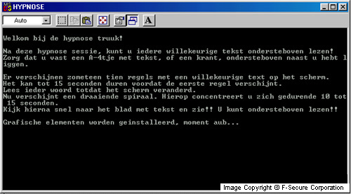 Welkom bij de hypnose truuk! Na deze hypnose sessie, kunt u iedere willekeurige tekst ondersteboven lezen! Zorg dat u vast een A-4tje met tekst, of een krant, ondersteboven naast u hebt liggen. Er verschijnen zometeen tien regels met een willekeurige text op het scherm. Het kan tot 15 seconden duren voordat de eerste regel verschijnt. Lees ieder woord totdat het scherm veranderd. Nu verschijnt een draaiende spiraal. Hierop concentreert u zich gedurende 10 tot 15 seconden. Kijk hierna snel naar het blad met tekst en zie!! U kunt ondersteboven lezen!! Grafische elementen worden geinstalleerd, moment aub...