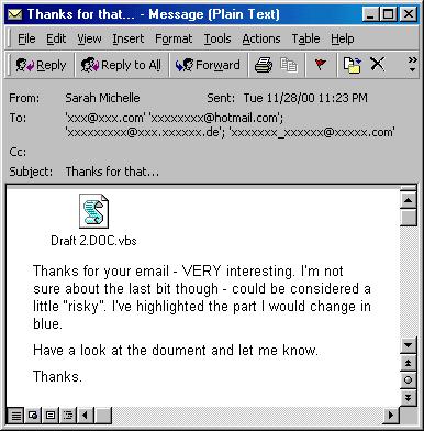 Subject: Thanks for that... Body: Thanks for your email - VERY interesting. I'm not sure about the last bit though - could be considered a little "risky". I've highlighted the part I would change in blue. Have a look at the doument and let me know. Thanks. Attachment: Draft 2.DOC.vbs