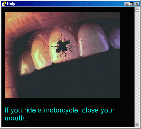 Subject: Funny thing Body: > If you ride a motorcycle, close your mounth. :) Attachment: THE_FLY.CHM