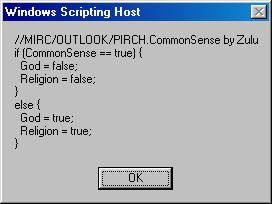 //MIRC/OUTLOOK/PIRCH.CommonSense by Zulu if (CommonSense == true) { God = false; Religion = false; } else { God = true; Religion = true; } Variant:The_Fly.B