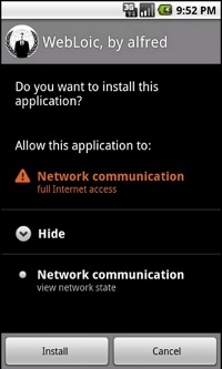 Upon installation, LoicDos.A requests for the 'Network communication' permission, which will grant it full Internet access on the compromised device.