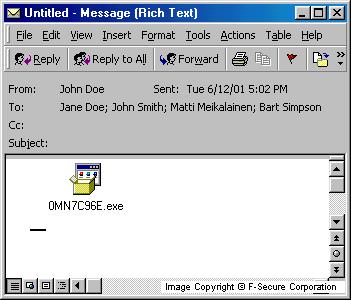 On "ItemSend" (a message is being sent) the worm looks for already attached files, gets the first one, replaces it with its own copy, renames attach to .EXE, and then sends it. If the message has no attach, the worm attaches itself with eight bytes random name and .EXE extenstion.