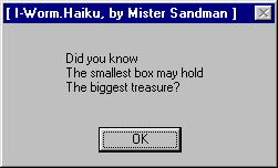 When the worm is run it first installs itself as HAIKUG.EXE into root Windows directory and modifies WIN.INI to be run during all further Windows sessions. After that the worm displays a messagebox with a randomly generated Haiku: