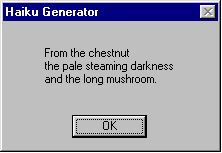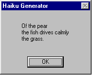 :)) ----- Original Message ----- >"Old pond... > a frog leaps in > water's sound." >- Matsuo Basho. > >DO YOU WANT TO COMPOSE YOUR OWN HAIKUS? > >Haiku is a small poetry with oriental metric that appeared in the >XVI century and is being very popular, mainly in Japan and the USA. > >It's done to trascend the limitation imposed by the usual language >and the linear/scientific thinking that treat the nature and the >human being as a machine. > >It usually has 3 lines and 17 syllables distributed in 5, 7 and 5. >It must register or indicate a moment, sensation, impression or >drama of a specific fact of nature. It's almost like a photo of >some specific moment of nature. > >More than inspiration, what you need in order to compose a real >haiku is meditation, effort and perception. > >DO YOU WANT TO COMPOSE YOUR OWN HAIKUS? > >Now you can! it is very easy to get started in this old poetry >art. Attached to this email you will find a copy of a simple >haiku generator. It will help you in order to understand the >basics of the metric, rhyme and subjects which should be used >when composing a real haiku... just check it out! it's freeware >and you can use and spread it as long as you want!