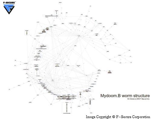 The following picture briefly shows the structure of the Mydoom.B worm, which can be appreciated in full detail in the PDF graph available here.