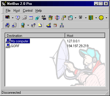 1. Open/close the CD-ROM tray once or in intervals (specified in seconds); 2. Show optional BMP or JPG image (full path allowed); 3. Swap mouse buttons - the right button gets the left button's functions and vice versa; 4. Start optional application (full path allowed); 5. Play optional WAV sound-file (full path allowed); 6. Point the mouse to optional coordinates; 7. Show a message dialog on the screen and allow the user on remote system to answer it; 8. Shutdown Windows, reboot, logoff or power off; 9. Go to an optional URL within the default web-browser; 10. Send keystrokes to the active application on the target computer; 11. Listen for keystrokes on remote system and save them to file; 12. Get a screenshot from remote computer; 13. Return information about the target computer; 14. Upload any file to the target computer or update the server part of NetBus; 15. Increase and decrease the sound-volume; 16. Record sounds that the microphone catch - to listen what happens in the room where remote computer is; 17. Make click sounds every time a key is pressed; 18. Download and deletion of any file from the target system; 19. Blocking certain keys on the remote system keyboard; 20. Password-protection management of the remote server; 21. Show, kill and focus windows on remote system.