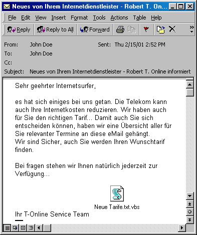 Subject: Neues von Ihrem Internetdienstleister - Robert T. Online informiert Body: Sehr geehrter Internetsurfer es hat sich einiges bei uns getan. Die Telekom kann auch Ihre Internetkosten reduzieren. Wir haben auch fur Sie den richtigen Tarif...Damit auch Sie sich entscheiden konnen, haben wir eine ubersicht aller fur Sie relevanter Termine an diese eMail gehangt. Wir sind Sicher, auch Sie werden Ihren Wunschtarif finden. Bei fragen stehen wir Ihnen naturlich jederzeit zur Verfugung... Ihr T-Online Service Team Attachment: Neue Tarife.txt.vbs