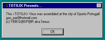 The virus has a payload: it deletes anti-virus data file ANTI-VIR.DAT if found. On 24th of September the virus displays a MessageBox and halts the system: