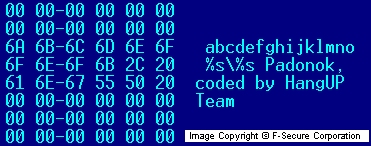 The trojan's file is a PE executable 51712 bytes long. The trojan's file is encrypted and the decryption routine is polymorphic. Every time the trojan installs itself, it changes its decryptor, so its file will look different after every installation.The original backdoor code contains rootkit functionality, but this variant uses it only to hide its processes, not its files. It should be noted that the files are still visible if viewed from Command shell (CMD.EXE). Based on available evidence, the original Padodor code was suspected to be a creation of a Russian hacker group called HangUp Team. Until the G variant was released, their copyright was in the backdoor files: