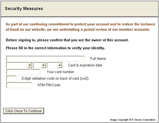 If such text strings are found, the trojan tracks the login and password entered by the user and saves it to a file called DNKK.DLL located in Windows System folder. The trojan can also display a fake webform and ask a user to select his/her credit card type, input his/her full name, credit card number, expiration date, CVV2 code and ATM PIN. The collected data is stored in a file called KK32.DLL file located in Windows System folder. Here's a screenshot of the fake form displayed by the trojan: