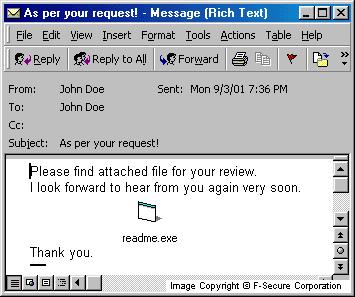 Readme is a simple mass-mailer written in Visual Basic. The worm has been found in the wild on September 3rd, 2001. It is a PE EXE file 24576 bytes long. Its code is not compressed.