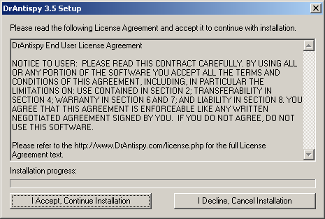 During installation, the DrAntiSpy family displays a generic end user license agreement (EULA), as seen in this representative example:
