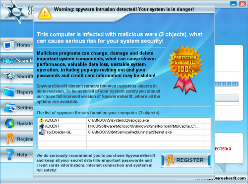Rogue:W32/SpywareSheriff is an rogue antispyware application that uses false and/or misleading scan results and questionable interface design to push the user into purchasing a license. In some cases, Spywaresheriff is advertised by a trojan with a hoax message that the system is unsafe. The trojan, detected as not-virus:Hoax.Win32.VB.l, does not install the antispyware application but simply generates a message that the system is unsafe: