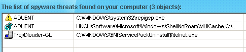 The message above was generated on a previously clean system image. Note that the third item listed is telnet.exe, a Microsoft application installed with the Windows Operating System. The first and second items listed in this example are the trojan malware referred to above. The only simple way to close the application is to register for the license, and the license is required for any cleaning of supposedly detected malware. The SpywareSheriff antispyware application itself is not necessarily harmful to the user's computer.
