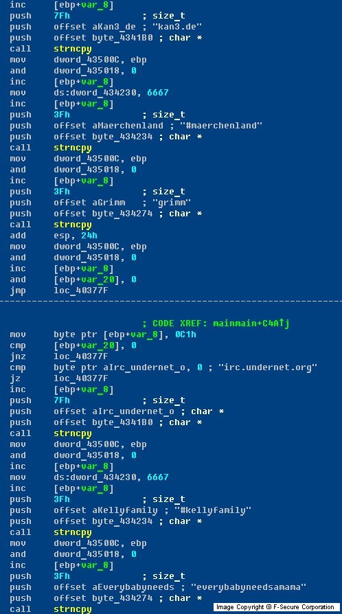 * perform ping, SYN, ICMP and UDP flood * get system information including information about OS, network and drives * update the backdoor's file from Internet * operate backdoor's bot (nick change, join/part channels, etc.) * redirect traffic on certain ports * open a URL with default web browser * steal CD keys from popular games * spread to computers via LAN (performs dictionary attack on share passwords) * join and spy on certain IRC channels * start remote processes using PSEXEC.EXE utility (extracted from the backdoor) * download and execute files