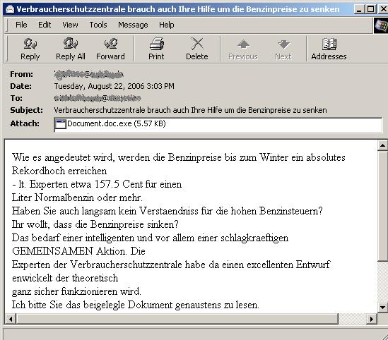 Small.DOG may be delivered to the system in an infected file attachment accompanying German-language spam email messages, such as below: