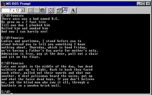 The 1.1 version of this virus contains several internal text strings and rhymes. They are output only once when the virus starts from a dropper (that is 1 byte longer than the virus body):