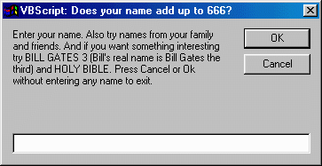 The game asks for users name. When user enters anything to the dialog and presses the "OK" button, it calculates the sum of ASCII characters.