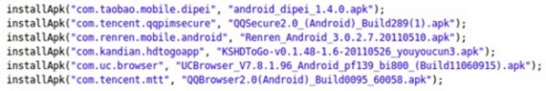 Snippet of code that instructs FjCon.A to install applications onto the device