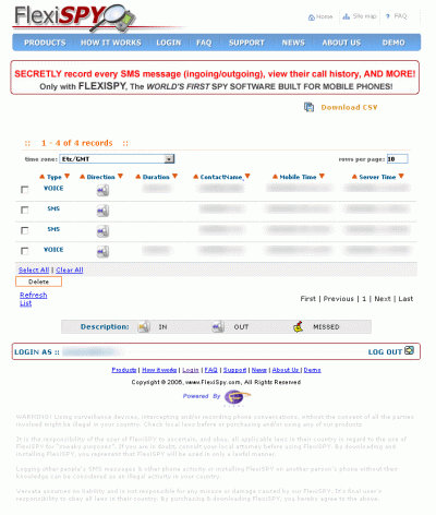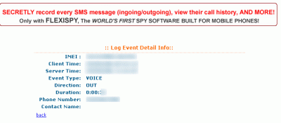 Flexispy.A records both voice call and SMS information and sends the details to the FlexiSpy server. From there the information can be accessed through a web browser.