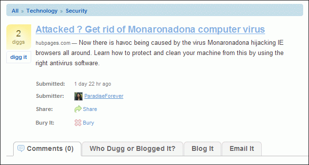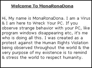 MonaGray.A also sets Internet Explorer's title bar to "MonaRonaDona" and disables the system's Task Manager.Its primary purpose is to direct the victim to search for the term MonaRonaDona.Search engines directed to prepared results promoting "Unigray Antivirus".Example from Digg.com: