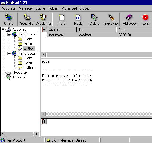 An application called Promail 1.21 is a trojan. This version was distributed on several shareware sites in March 1999.