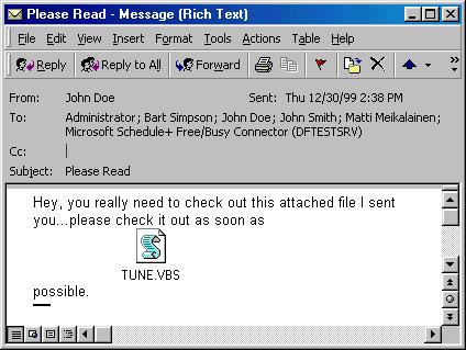 The worm uses Outlook application to send itself as an attachment to all recipients in every address book. The email message that VBS/Tune sends contains the following subject and body: